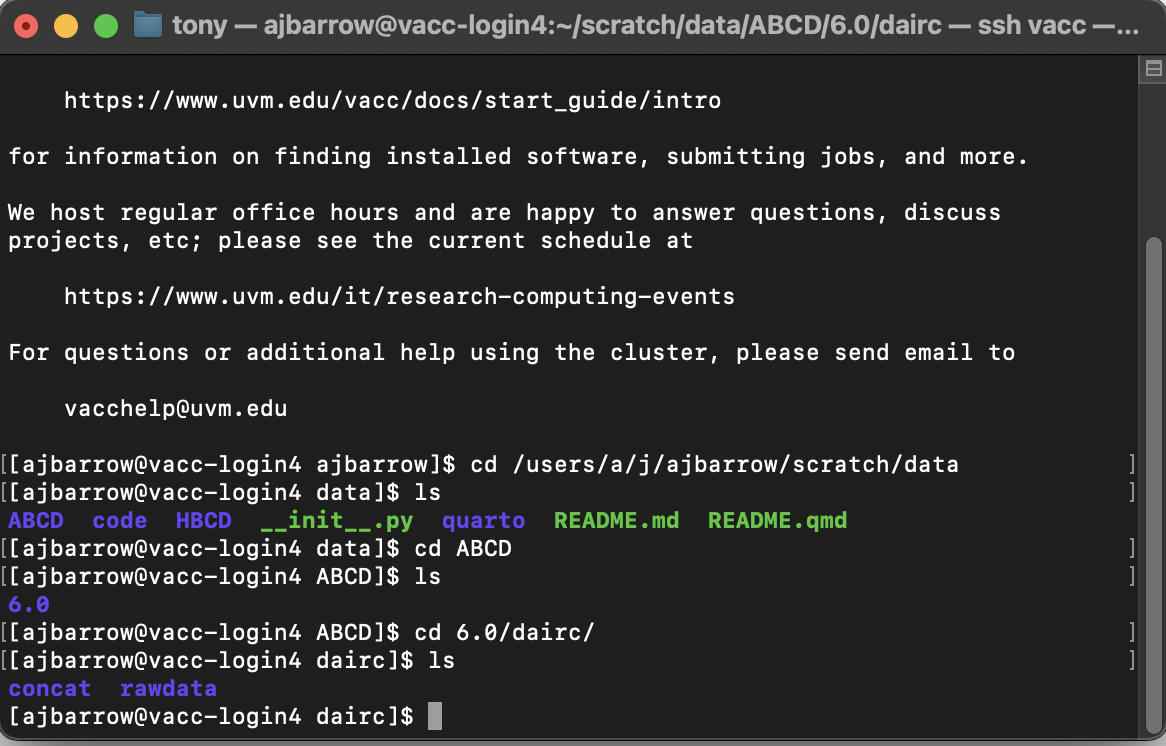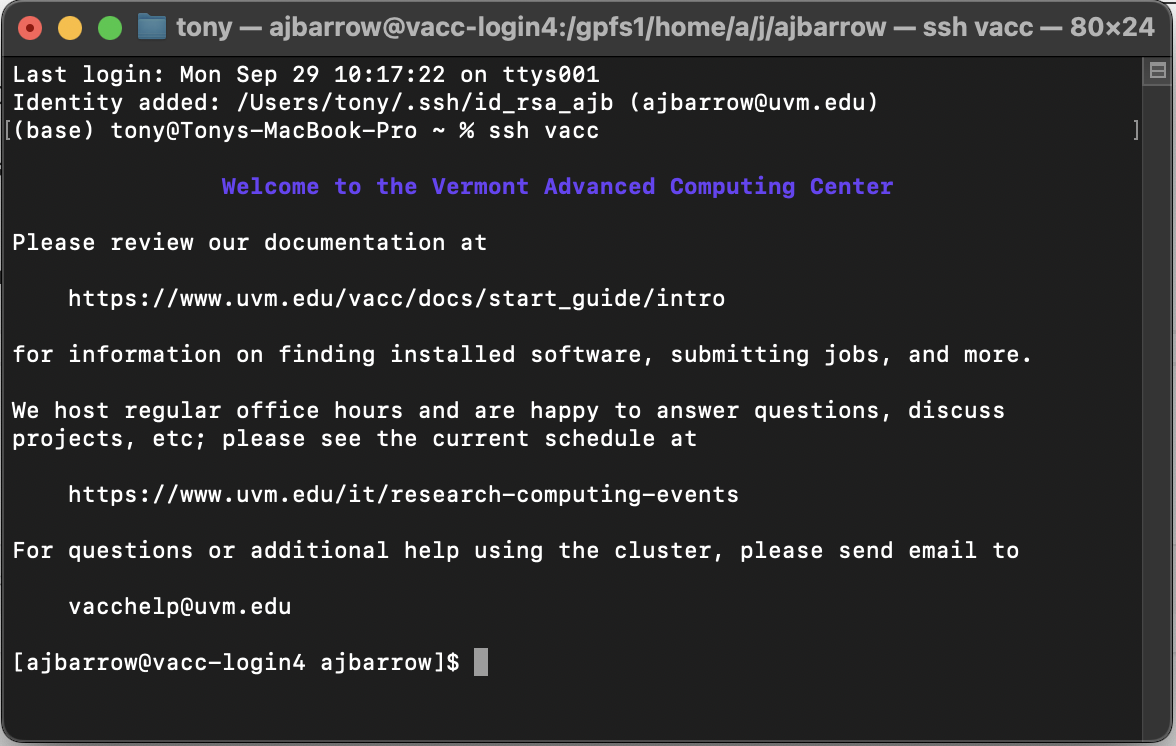 I’m going to assume you’ve reviewed these guides and have successfully connected to a VACC login node using SSH. I have an SSH “alias” set up to make things easier: